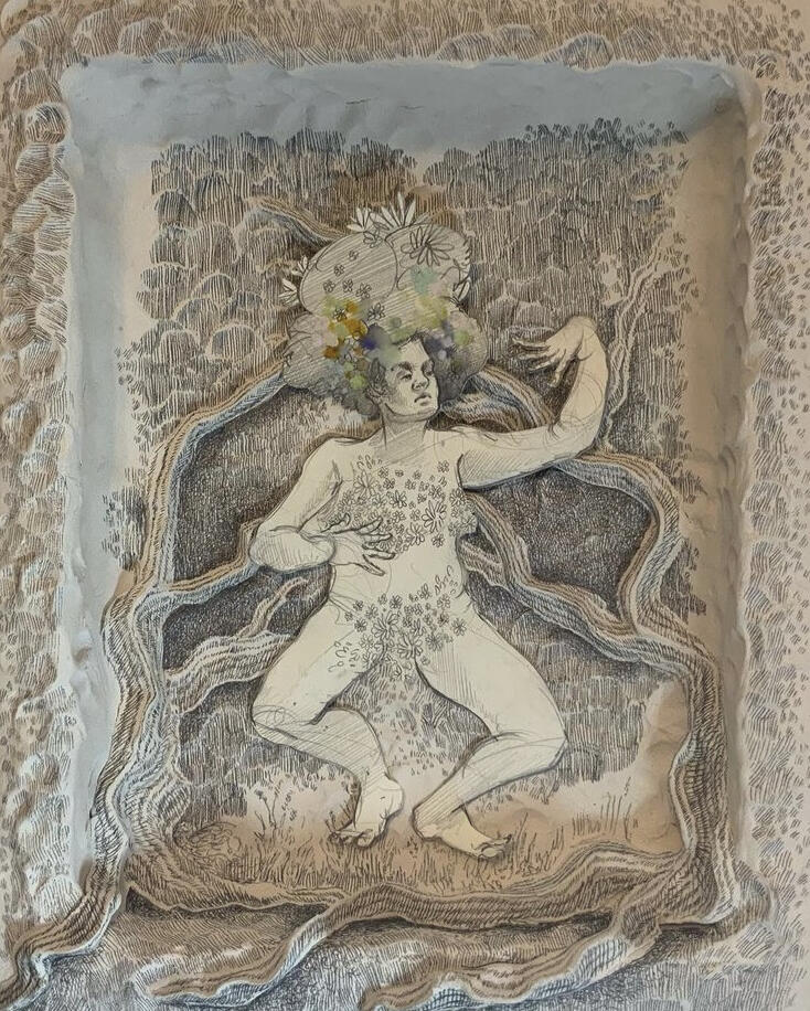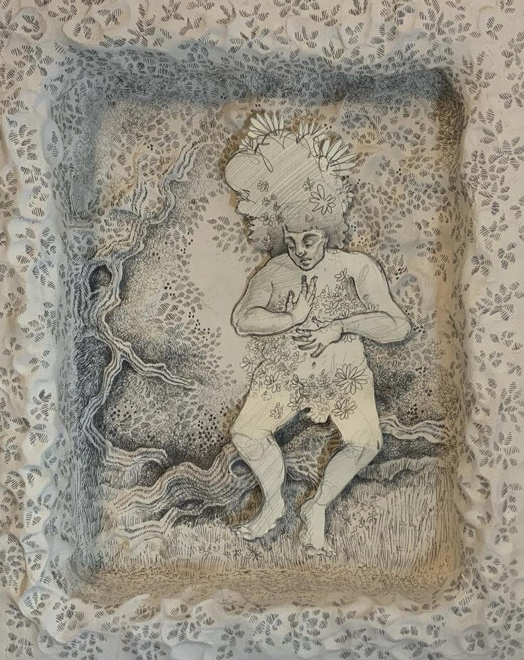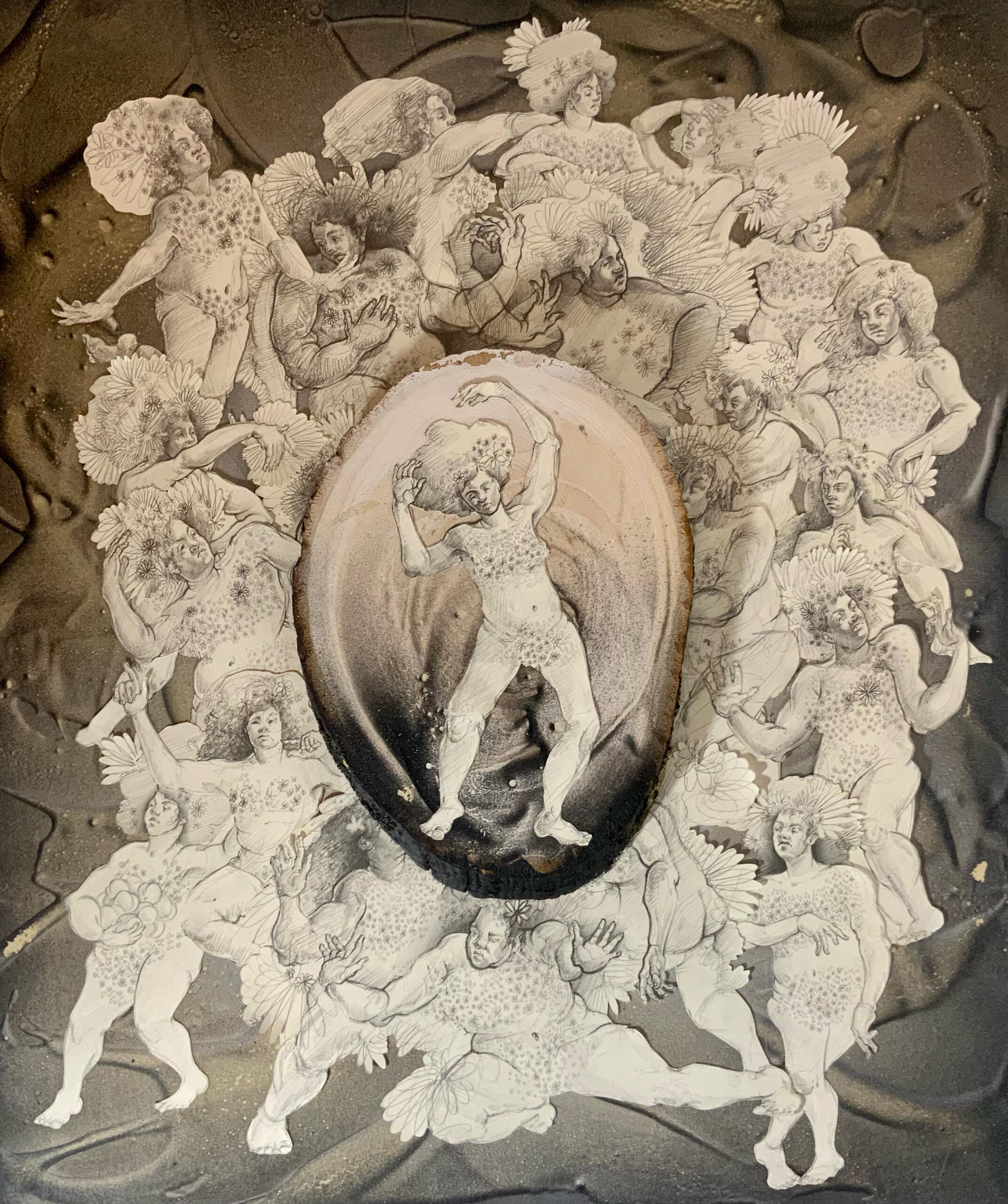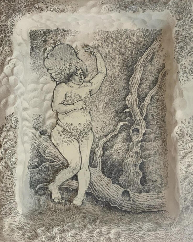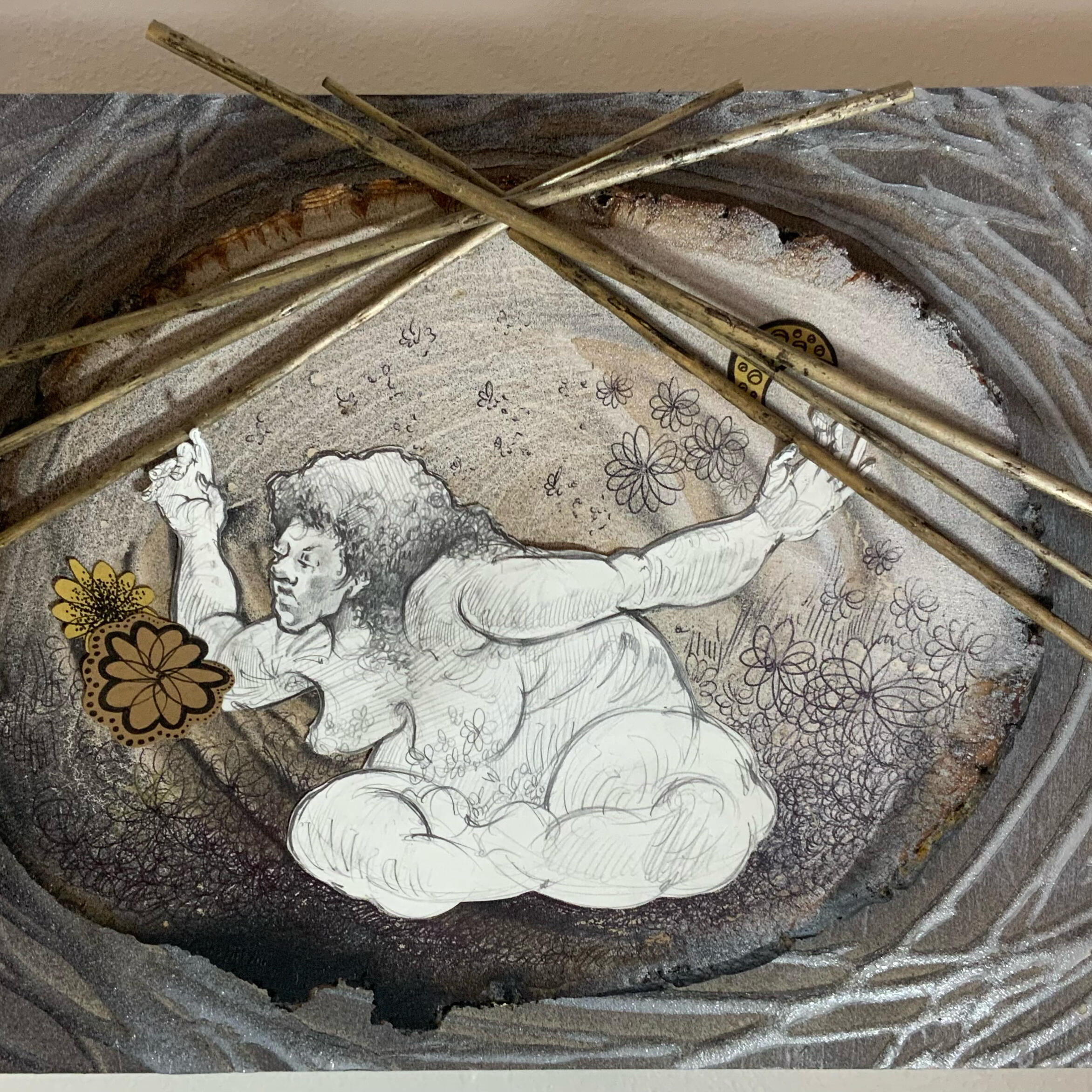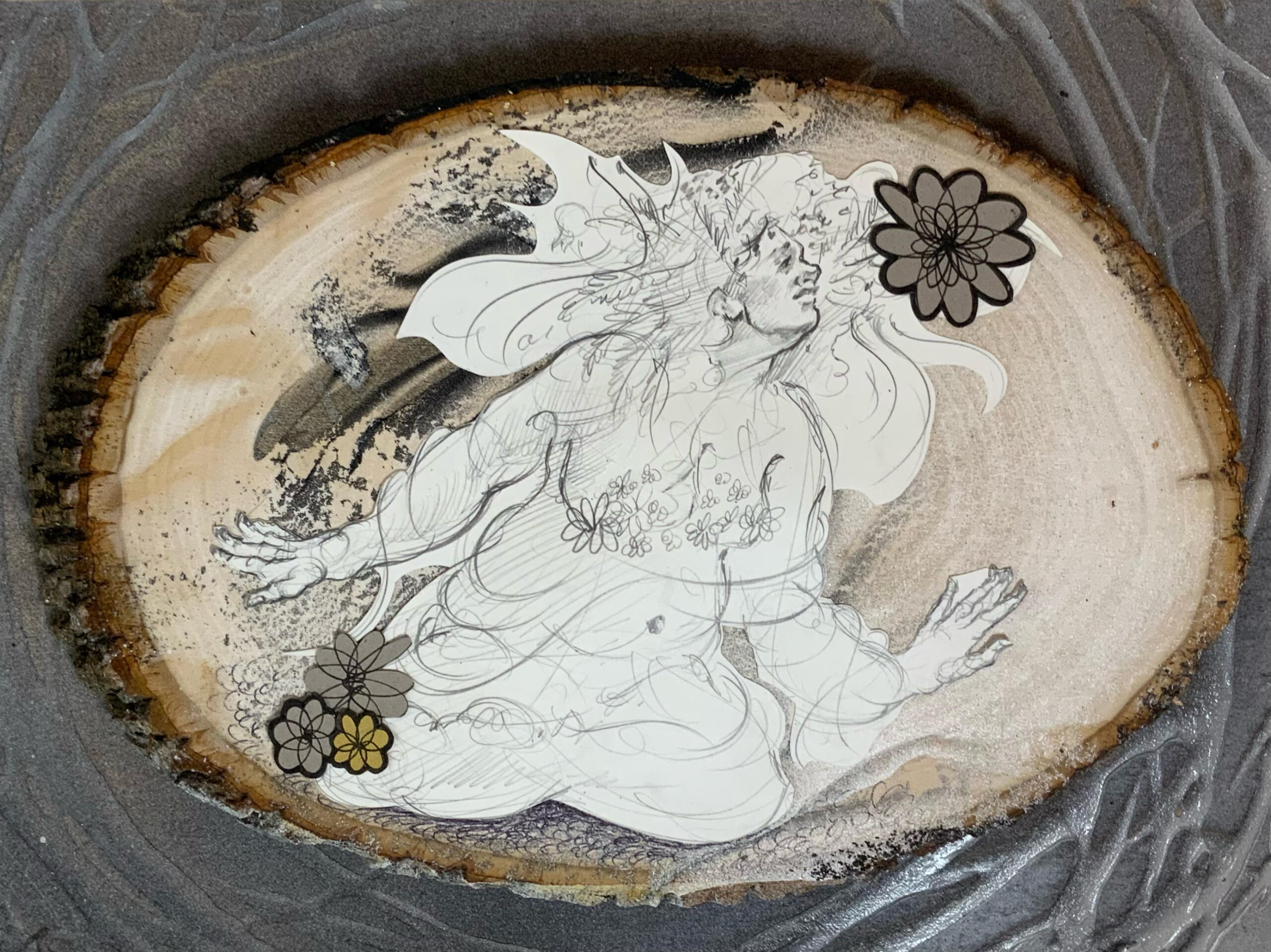 “You didn’t come into this world. You came out of it, like a wave from the ocean. You are not a stranger here.” -Alan WattsAfter a year in deep meditation, I began visiting a void beyond mindfulness itself. It was a hole of nothingness consisting of everything and nothing all at once. The scape and the self rippled into one, and I realized the truth that to live was to meander. In this series, paperclay is sculpted to revitalize old, abandoned objects and renew them into awakening, shedding the light on our true inner spirit. Gestural sculptural applications convey the pulsating underlying waves of collective unconsciousness. Intensive graphite surface textures depict our physical reality beginning to break free from constraint. Trusting intuition through stream of consciousness work styles, drawings are coaxed out of the sculptural forms, unplanned and taking on a life of their own. At the heart of the series, the ephemeral figures are enjoying the moment and breaking free of all barriers by dancing and unifying into the scapes.