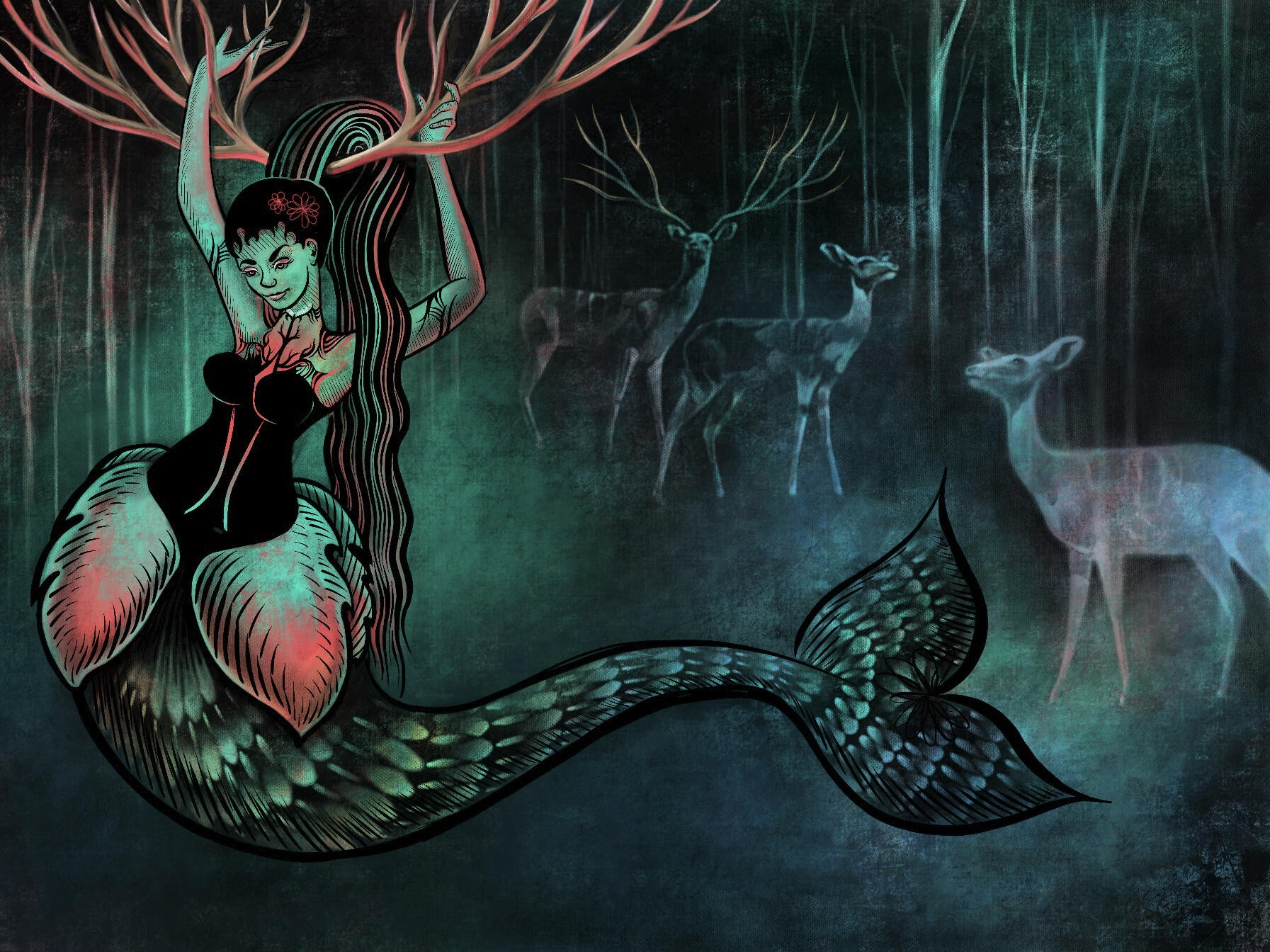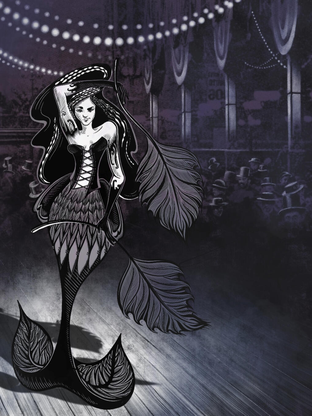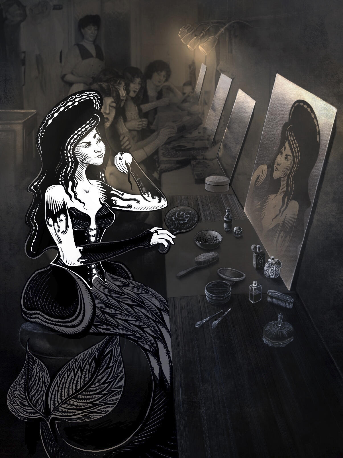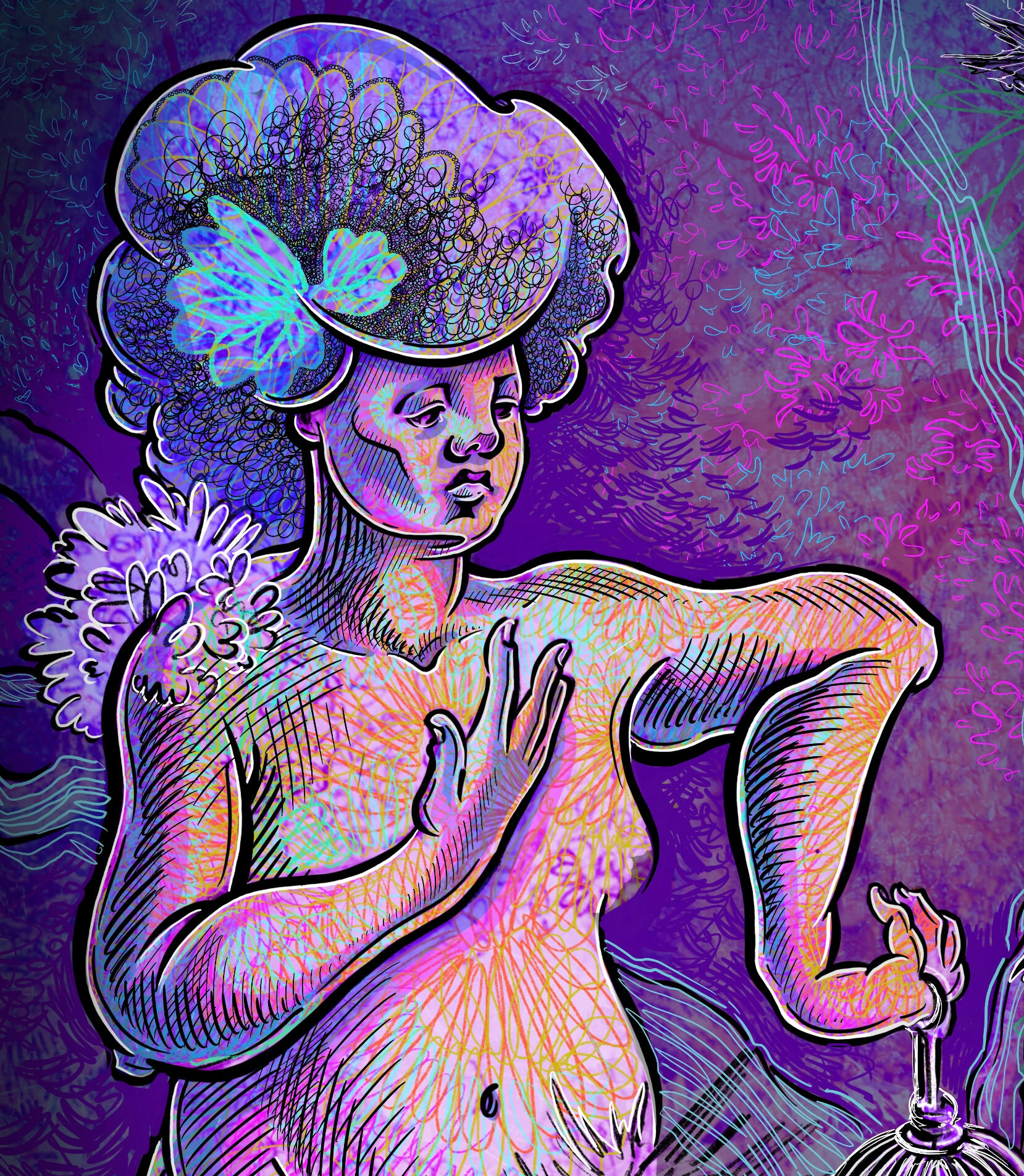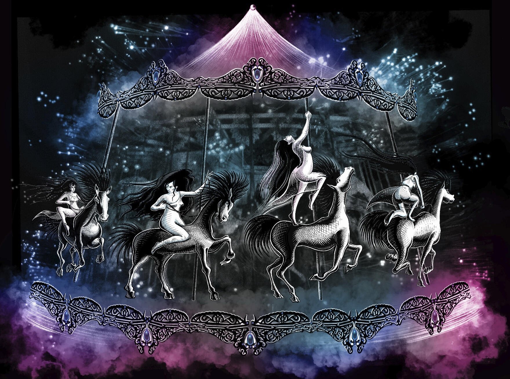 Somewhere between theater and a dream, The Cabinet of Soft Revolt unfolds like a stage set left glowing after the curtain falls. Here, myth-women intermix with absurdist characters in worlds that shimmer with nostalgia. These works take on elements of the surreal, slipping out of history’s frame. Through digital ink work and layered vintage textures and photography, I re-imagine feminine archetypes not as performers for an audience, but as secret keepers of utmost fantastical fun and play.